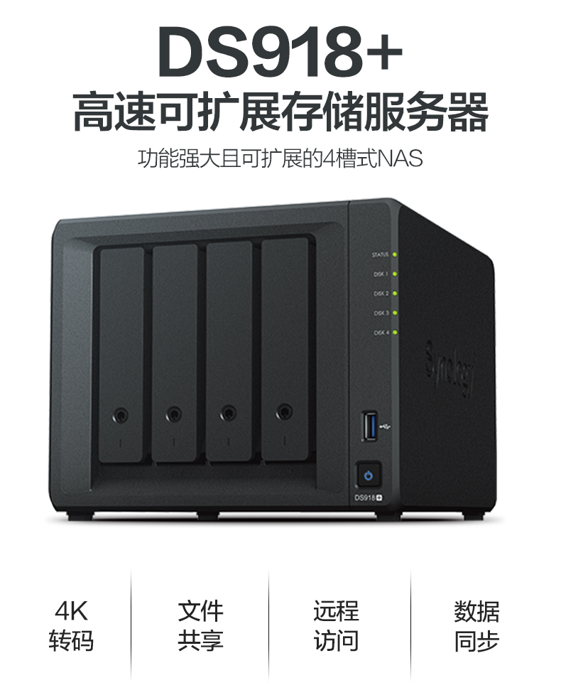 DS918+ 支持多達兩個 M.2 NVMe 2280 SSD,無需占用內(nèi)部硬盤插槽即可快速創(chuàng)建系統(tǒng)緩存。DS918+ 可通過 Synology 擴充設備 DX517 擴展到多達 9 個硬盤,滿足了對靈活存儲容量的需求。