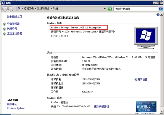 我的電腦右鍵點(diǎn)擊屬性,發(fā)現(xiàn)系統(tǒng)已變成Windows Storage Server 2008 R2,成功將Windows Server 2008 R2轉(zhuǎn)換。