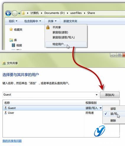 上述設(shè)置完畢,即可在Windows 7下開(kāi)啟某個(gè)文件夾的共享功能,使得Mac電腦可以讀取甚至寫(xiě)入文件的目的。打開(kāi)需要共享的文件夾——在窗口上方的“共享”下拉菜單中點(diǎn)擊“特定用戶…”——在彈出的選項(xiàng)窗總添加“Guest”,并將權(quán)限級(jí)別進(jìn)行相應(yīng)設(shè)置。