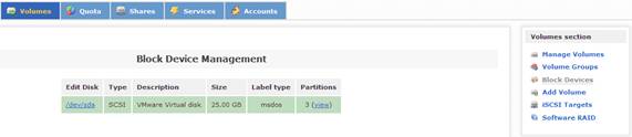 當(dāng)配置好系統(tǒng)的安全訪問控制后,接下來的一步是配置系統(tǒng)磁盤,實(shí)現(xiàn)虛擬存儲(chǔ)服務(wù)。在 Openfiler 中,有三類存儲(chǔ)概念:Block Device,Physical Volume 和 Volume Group。其中,Block Device 表示的是實(shí)際的物理磁盤;Physical Volume 表示的是物理磁盤的分區(qū),它是組成 Volume Group 的單元;Volume Group 則是由一個(gè)或多個(gè)物理磁盤分區(qū)(Physical Volume)組成,它又是組成 Logical Volume 的單元。