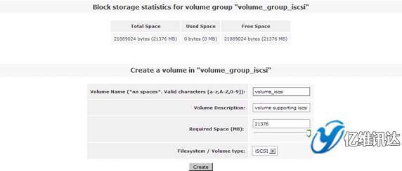 接著在右側(cè)的“Volumes section”區(qū)域選擇“Volume Groups”來創(chuàng)建一個(gè)卷組。在區(qū)域“Create a new volume group”處填寫卷組 volume group 的名稱為“volume_group_iscsi”,同時(shí)勾選剛剛在上一步所創(chuàng)建的物理卷 /dev/sda4,最后點(diǎn)擊“Add volume group”。如圖